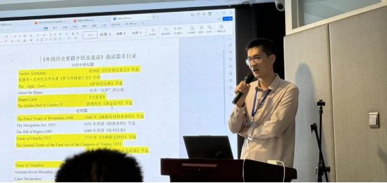 在9月20日上午的主题报告环节中,刘俊豪老师以《从〈外国历史要籍介绍及选读〉课程谈世界史专业外语教学实践》为题,结合教学实际,深入阐述了世界史学科在外语教学中的创新做法,提出原典导读能够有效提升学生的史学素养和国际视野,并分享了我们在课程设置上的积极探索。报告引起了与会学者的广泛关注与热烈讨,主持人、安阳师范学院历史与文博学院党委书记徐永杰对此予以高度赞许,指出该发言为全省世界史专业外语教学提供了可借鉴的经验,彰显了河南省世界史学科青年学人的良好风貌和丰厚实力。